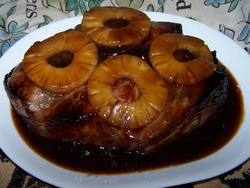 A sweet-savory roasted pork loin marinated in soy, ginger, and garlic, then glazed with a glossy pineapple-cornstarch sauce. The tender meat rests on caramelized pineapple slices with a warm, syrupy glaze spooned over top. Perfect for weeknight dinners or casual entertaining, this recipe balances umami depth with tropical brightness. The extended marinade ensures juicy, well-seasoned meat that stays moist through roasting.