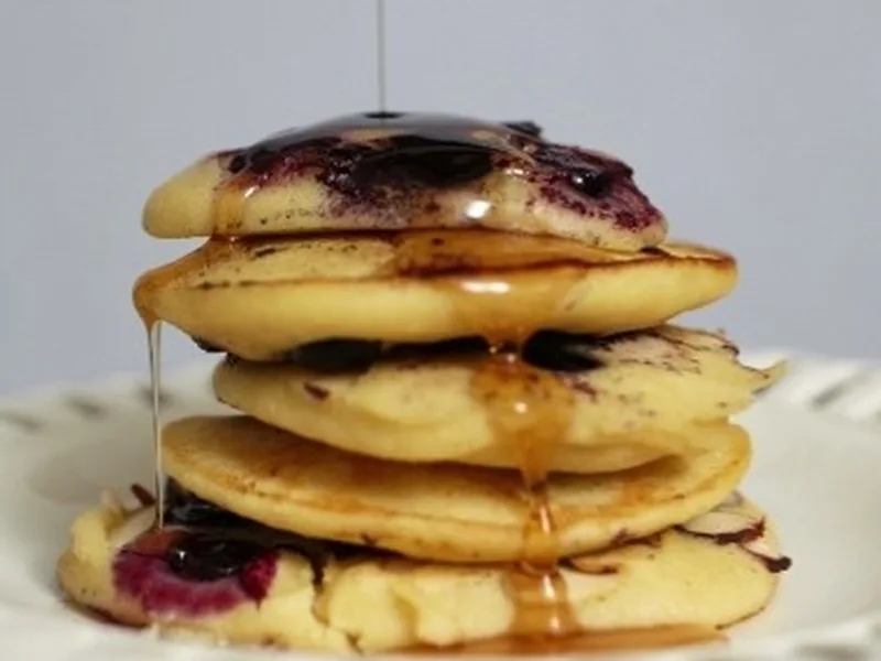 Serve stacked warm, alternating blueberry sides up and down, with maple syrup and butter.