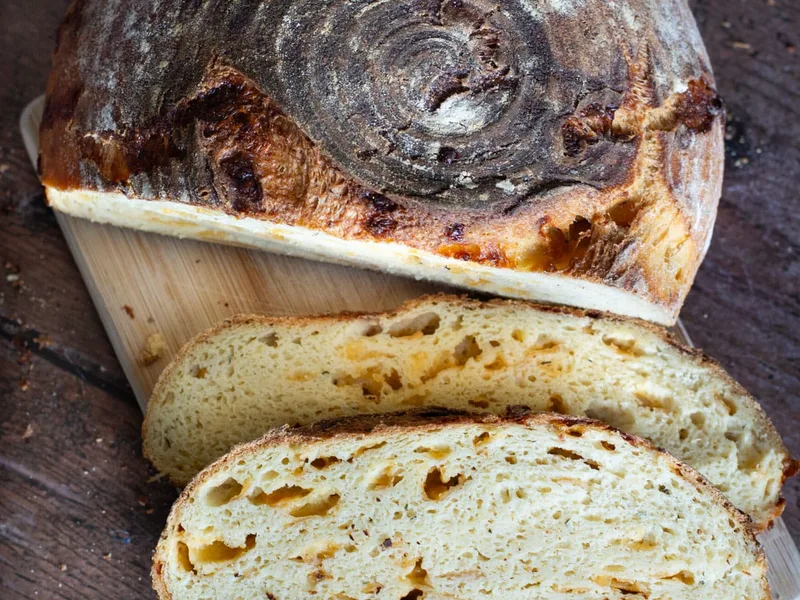 Tangy sourdough loaf enriched with sharp cheddar cheese and psyllium husk for structure. Uses a sourdough starter and requires a long rise until doubled. Baked with steam using either a Dutch oven or pan-and-ice method. Internal temperature reaches 210F. Cool completely before slicing for best texture.