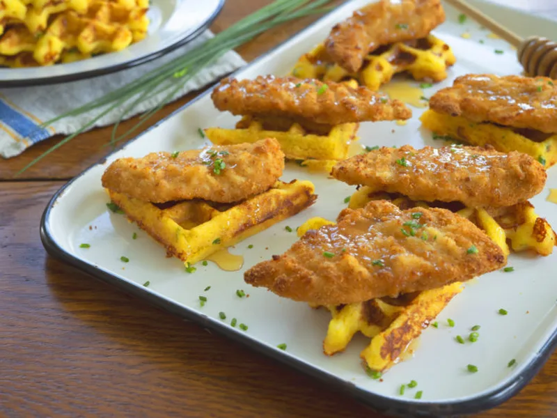 Cut waffles into quarters and serve hot with chicken tenders, drizzled with honey and sprinkled with chives.