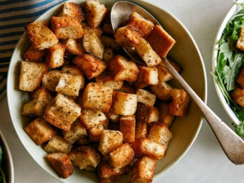 Golden, crispy gluten-free croutons made from cubed bread tossed with garlic and onion powder, oregano, and olive oil. Broiled low and slow until deeply browned and dry, then rested in the oven for enhanced crispness. Perfect for salads or soups.