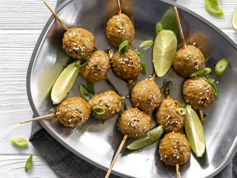 Pre-made chicken meatballs baked then threaded onto skewers, glazed with teriyaki sauce, and finished with scallions and sesame seeds. Quick weeknight appetizer or main course requiring minimal prep.