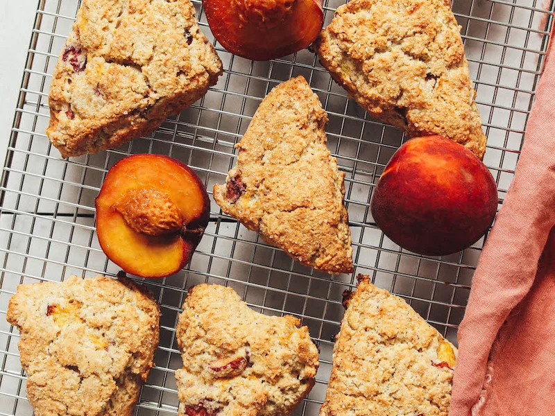 Do not overmix dough after adding peaches to avoid breaking down fruit and creating tough, dense scones.