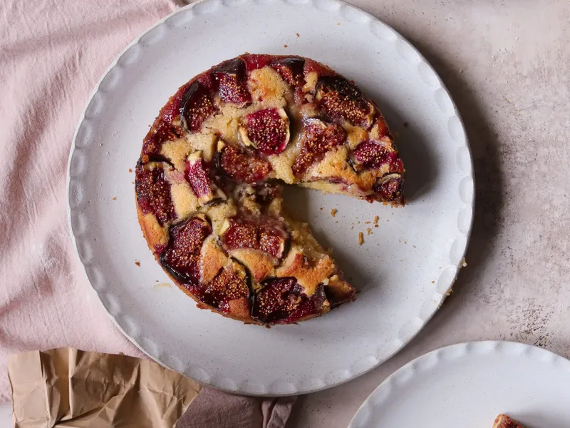 Dutch-style gluten-free cake combining almond and gluten-free flour with Greek yogurt for moisture. Fresh figs are scattered across the batter in varying cuts before baking, creating a playful presentation. The cake bakes at 175°C for 55 minutes until golden, then cools in the pan before serving.