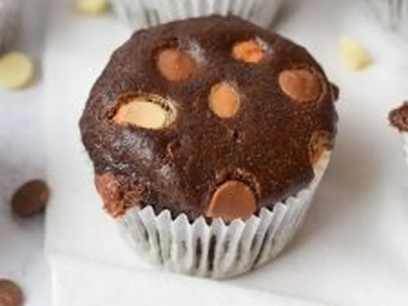 Fudgy gluten-free chocolate muffins loaded with white, milk, and dark chocolate chips. Made with gluten-free flour blend, cocoa powder, and lactose-free milk. Baked until a skewer emerges clean, with a tender crumb and rich chocolate flavor throughout.
