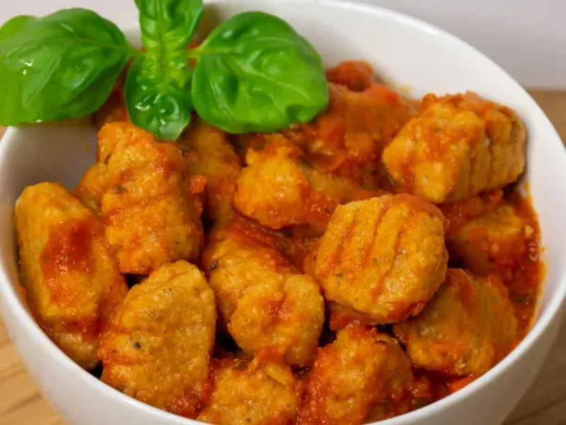 Tender gnocchi made from sweet potato puree and oat flour, shaped by hand and boiled until they float. Finished in a hot skillet with olive oil and topped with tomato sauce. A naturally gluten-free pasta alternative with a soft, pillowy texture.
