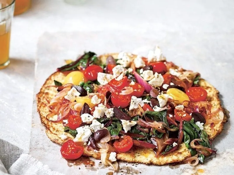A low-carb, gluten-free pizza that swaps traditional dough for a crispy cauliflower crust bound with egg, ground almonds, and Parmesan. Topped with sauteed chard, cherry and vine tomatoes, kalamata olives, and garlic, this dish delivers robust Mediterranean flavors with tender greens and briny olives against a golden, crunchy base. The combination of textures—crispy crust, soft vegetables, creamy goat's cheese—makes it satisfying without grains. Ideal for anyone eating low-carb, paleo, or keto; also perfect for weeknight dinners, lunch bowls, or entertaining health-conscious guests. Serve warm with optional chilli oil for heat. This version emphasizes whole vegetables and quality fats over processed alternatives, making it genuinely nourishing.