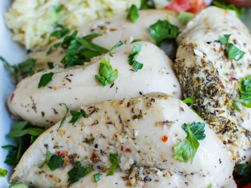 Marinated boneless chicken breasts baked with oregano and red wine vinegar, served over whole wheat orzo tossed with yogurt-dill dressing and cucumber. Finished with fresh tomatoes, feta, olives, and herbs for a light Mediterranean meal.