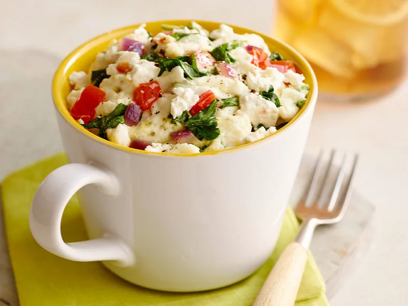 A quick microwave egg mug loaded with spinach, red onion, tomato, and crumbled feta cheese, finished with fresh basil. This high-protein breakfast comes together in under five minutes for a light, Mediterranean-inspired start to your day. Perfect for meal prep or when you need something fast and satisfying. The key is patting the tomato dry to prevent excess moisture and sogginess.