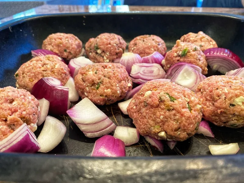 A rustic one-pan Greek supper that combines tender spiced lamb meatballs with caramelized red onions, tangy tomato sauce, and creamy feta cheese. The dish balances warm cinnamon and oregano against bright lemon and fresh feta, creating layers of Mediterranean flavor that feel both comforting and refined. Crispy bread chunks mixed into the meat add moisture and delicate texture; the remaining feta scattered over top melts slightly from residual heat. Perfect for weeknight entertaining or casual family dinners, this tray bake requires minimal active cooking and one pan—ideal when you want impressive results without fuss. The beauty lies in its simplicity: roasting concentrates the onion's sweetness while the tomato sauce mingles with meatball juices into a sauce begging for bread. Unlike lighter Greek preparations, the cinnamon adds subtle warmth that distinguishes this version from standard Mediterranean meatballs.