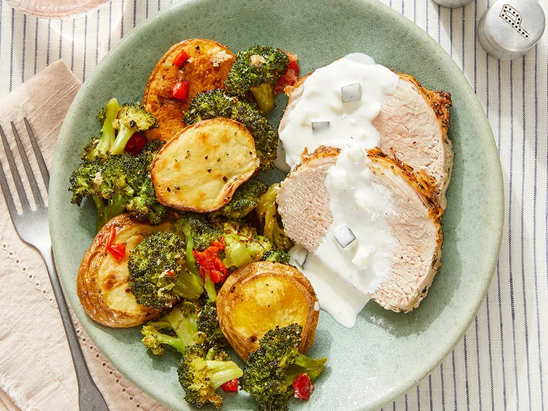 A restaurant-quality Greek-inspired pork roast featuring herb-crusted pork loin paired with roasted potatoes and broccoli finished with a bright lemon-garlic pan sauce and creamy tzatziki. The pork is seared in rosemary oil then oven-roasted to a tender, juicy finish while vegetables cook alongside, absorbing the Mediterranean flavors. The dish combines crispy-edged potatoes, tender broccoli, and tangy peppers with cooling tzatziki for a complete meal. Perfect for weeknight dinners that feel special or casual entertaining, this version streamlines the traditional Greek approach by roasting everything on sheet pans, minimizing cleanup while maximizing flavor. The combination of fresh rosemary, lemon, garlic, and oregano delivers classic Mediterranean taste without complexity. Ideal for home cooks seeking a balanced, protein-forward dinner that impresses without requiring advanced techniques or lengthy prep.