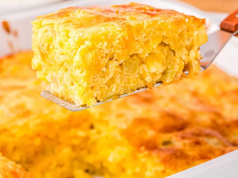 Cornbread-based casserole combining thawed frozen corn, roasted green chilies, sharp cheddar, and sour cream. Mixed with melted butter and eggs, then baked until golden. A savory-spiced side dish with Southwestern flavors, ready in under an hour.