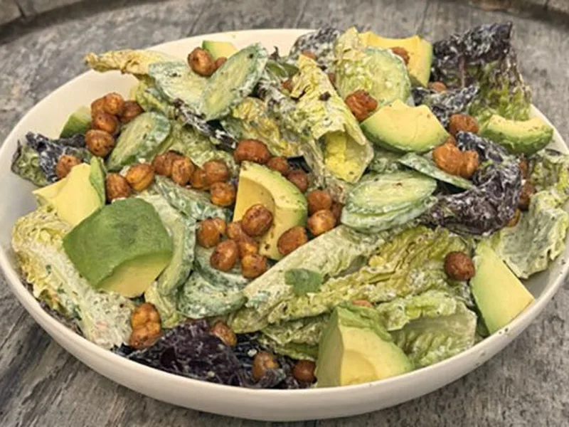 A vibrant, protein-packed salad combining peppery roasted chickpeas with creamy green goddess dressing made from fresh herbs, Greek yogurt, and Dijon mustard. Little gem lettuce, Persian cucumber, and avocado provide crisp freshness and richness, while warm spiced chickpeas add satisfying crunch and depth. The homemade dressing—bright with basil, dill, parsley, and mint—transforms simple ingredients into something restaurant-quality. This salad works for anyone seeking a vegetarian lunch that feels substantial without being heavy. Serve it as a standalone meal or alongside grilled protein. What sets this version apart is the contrast between the warm, crispy, cumin-forward chickpeas and the cool, herbaceous dressing, making it more interesting than standard green salads.