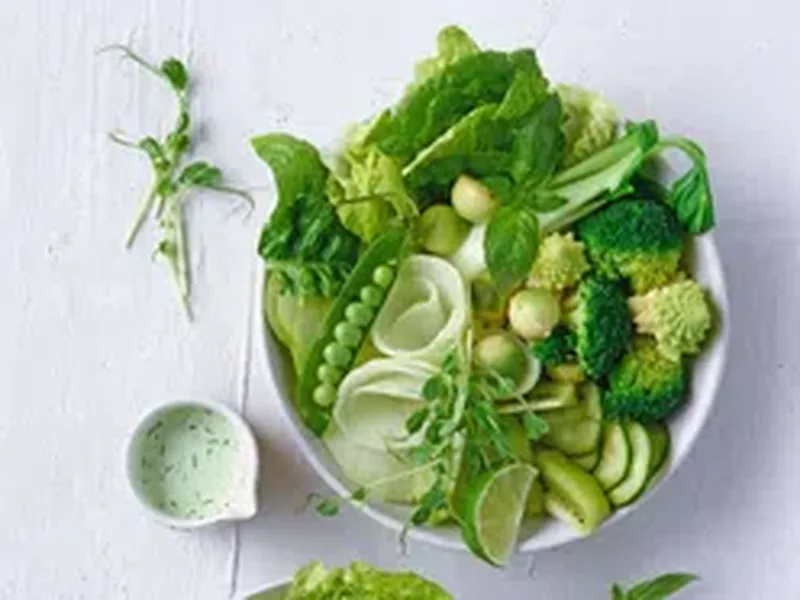 A vibrant, nutrient-dense salad bowl that combines raw and lightly cooked vegetables with cooked rice or noodles, topped with fresh fruit and a creamy herb yogurt dressing. This dish is special for its balance of textures—crispy raw vegetables, tender greens, chewy rice, and soft avocado—alongside bright, fresh flavors from kiwi, lime, and herbs. The key textures range from crunchy (romanesco, broccoli, raw apple) to smooth (avocado, yogurt dressing) to tender (cooked rice). The herb yogurt dressing is tangy and herbaceous, binding everything together without heaviness. Perfect for lunch, light dinners, or meal prep, this bowl works for vegetarians and anyone seeking a wholesome, colorful meal. The version here stands out through its mix of raw and briefly blanched vegetables, the unexpected addition of fresh fruit (kiwi, apple, lime), and the creamy herb dressing that replaces heavier vinaigrettes.