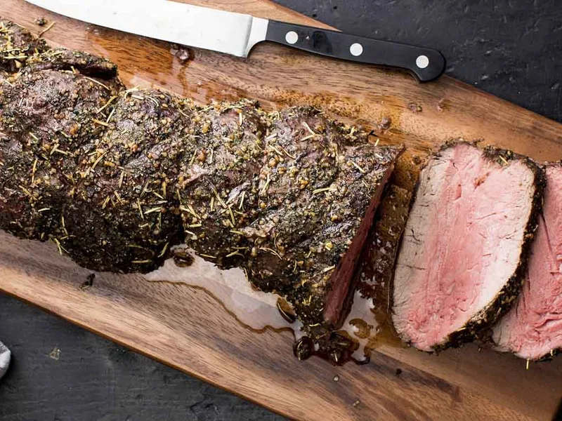Elegant beef tenderloin seasoned with Montreal spice blend, parsley, and rosemary, then low-temperature grilled for a perfectly pink center with a charred crust. The indirect-heat method ensures even cooking of this premium cut. Serve this special-occasion roast to impressive guests who appreciate quality beef, sliced thick and finished with a high-heat sear for textural contrast.