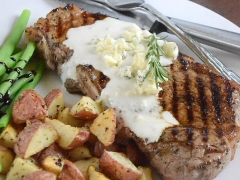 Grilled Black Pepper NY Strip with Blue Cheese Sauce