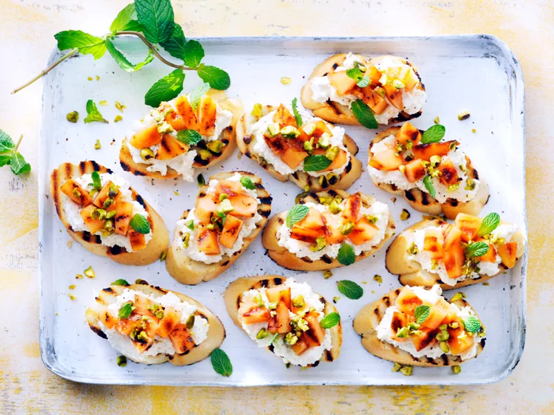 Charred cantaloupe chunks layered on crispy grilled baguette with creamy ricotta and Parmesan spread, finished with chopped roasted pistachios and fresh mint. A light, sweet-savory appetizer combining caramelized fruit with toasted bread and herbaceous garnish.