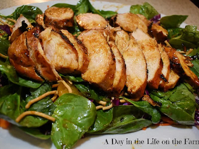 A vibrant composed salad that transforms simple ingredients into a restaurant-worthy dish through an unexpectedly rich ginger-molasses dressing. Sweet mandarin oranges and crunchy cashews play against peppery spinach and shredded vegetables, while grilled chicken marinated in the same bold dressing adds substance and protein. The dressing, whisked from apple cider vinegar, molasses, canola oil, fresh ginger paste, and soy sauce, creates a complex sweet-savory-spicy profile that ties every element together. This salad works for weeknight dinners and lunch meal prep, serving as an impressive dish for casual gatherings. The combination of warm grilled chicken, crisp greens, chewy chow mein noodles, and creamy cashews creates multiple textures in each bite. It's substantial enough to satisfy as a complete meal yet light enough for warmer months, making it equally at home at summer potlucks or on a desk lunch.