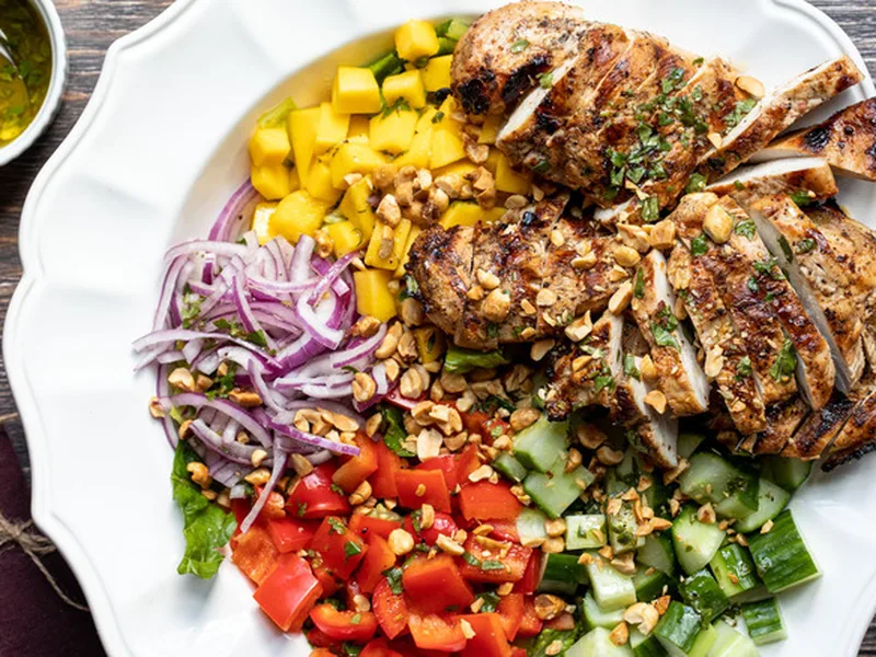 A vibrant, protein-packed salad featuring grilled marinated chicken breasts paired with fresh mango, crisp vegetables, and a bright honey-lime vinaigrette. The chili-spiced marinade adds warmth to tender chicken, while juicy mango provides natural sweetness and tropical flair. Crunchy peanuts and romaine lettuce complete this colorful dish. Ideal for summer lunches, light dinners, or meal prep. This version combines two flavor profiles—a savory spiced grilled element with a fresh, tangy dressing—for complexity beyond basic chicken salads.