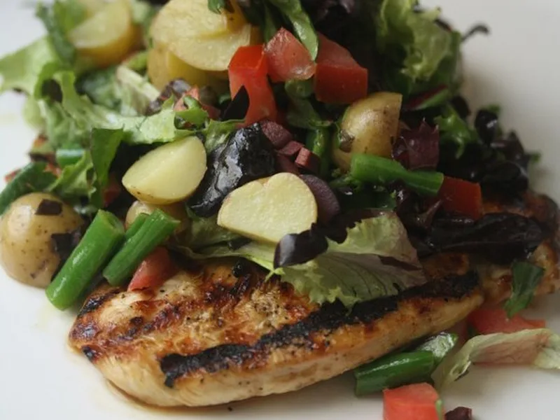 Chicken paillard—a thin, quickly grilled breast—pairs with a vibrant chopped salad inspired by the classic Nicoise. This dish balances a perfectly seared, golden chicken breast against a Mediterranean medley of tender green beans, waxy potatoes, briny olives, fresh tomatoes, and hard-boiled eggs, all bound by a bright lemon-mustard vinaigrette. The key to success is the quick, high-heat sear that creates a flavorful crust while keeping the meat tender inside. Special here: the salad is finely chopped, making each forkful contain all components. Ideal for weeknight dinners or light lunches, it's elegant enough for entertaining yet simple enough for everyday cooking. Serve warm or at room temperature. This version strips away the traditional anchovy while keeping the bright, briny spirit of Nicoise alive.