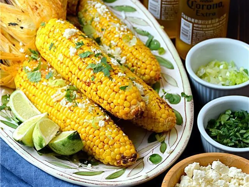 Serve immediately while husks are still warm and cheese is creamy. Provide lime wedges and extra napkins. Pairs with grilled chicken, steak, fish, or as part of a vegetable-forward meal.