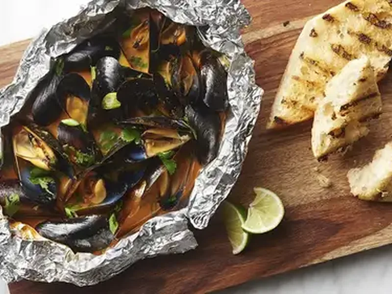 Keto Grilled Coconut Curry Mussels in Foil Packs