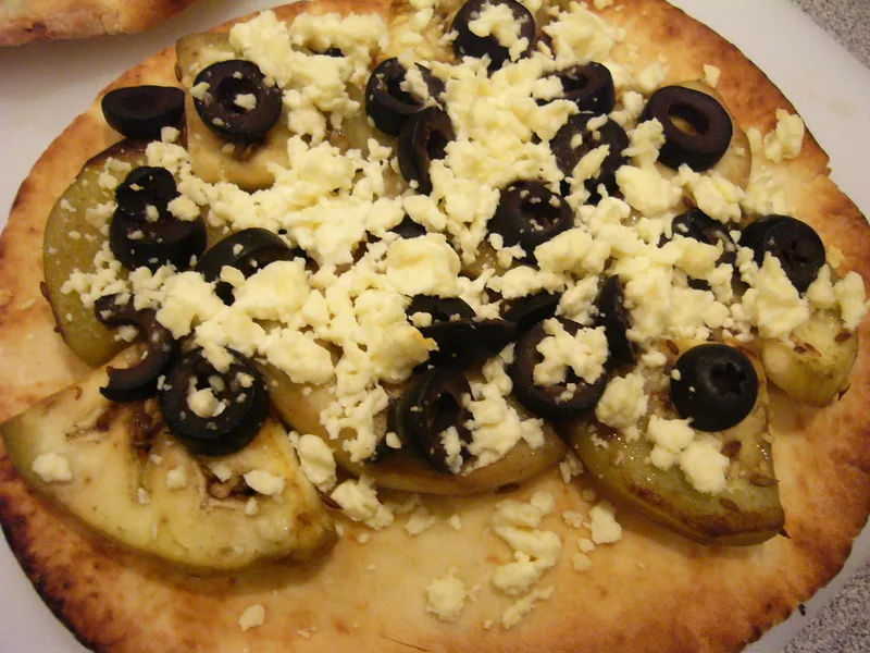 Flip bread over and top with grilled eggplant, olives, feta cheese, and pepper.