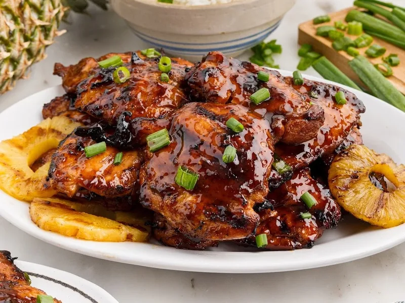 Huli huli chicken is a Hawaiian-style grilled dish featuring tender, caramelized chicken thighs glazed with a sweet and savory sauce anchored by brown sugar, ketchup, soy sauce, and pineapple juice. The name means 'turn turn' in Hawaiian, referencing the constant basting and flipping that builds a glossy, flavorful crust. Ginger, garlic, and apple cider vinegar add brightness and depth, while smoked paprika and cumin provide subtle warmth. Grilled pineapple rings contribute natural sweetness and char. This dish suits casual outdoor entertaining, weeknight family dinners, and anyone craving bold tropical flavors with minimal fuss. Serve it at summer barbecues, potlucks, or casual gatherings. What sets this version apart is the reserved sauce technique for finishing, ensuring a thick, clingy glaze without raw marinade, plus the addition of grilled pineapple that complements rather than competes with the main protein.