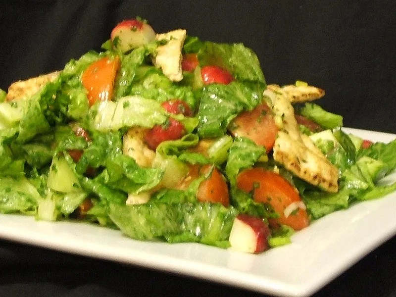 A vibrant Mediterranean-inspired salad featuring crisp grilled pita bread, fresh romaine, and aromatic herbs. Bright lemon-honey dressing with Dijon mustard brings tangy richness to crisp cucumber, radishes, tomatoes, and spring onions. Fresh flat-leaf parsley and mint add herbaceous depth. Serve as a light lunch, side dish, or vegetarian main. This version the classic fattoush with grilled rather than fried bread for a lighter take, plus generous fresh herbs that define the dish.