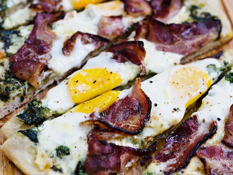 A savory grilled pizza that combines crispy, charred dough with vibrant basil pesto, melted Monterey Jack cheese, smoky bacon, and perfectly cooked eggs. The eggs cook gently on top of the pizza as it finishes on the grill, creating runny yolks that act as a sauce. This dish bridges breakfast and dinner, offering the comfort of pizza with the richness of a baked egg preparation. It's ideal for home cooks comfortable with grill management and works best for casual weeknight meals or entertaining. The grilling method adds depth that oven-baked pizza can't match, while the basil pesto and egg combination creates unexpected sophistication. Perfect served warm, straight from the grill, with crusty exterior and creamy egg yolks.