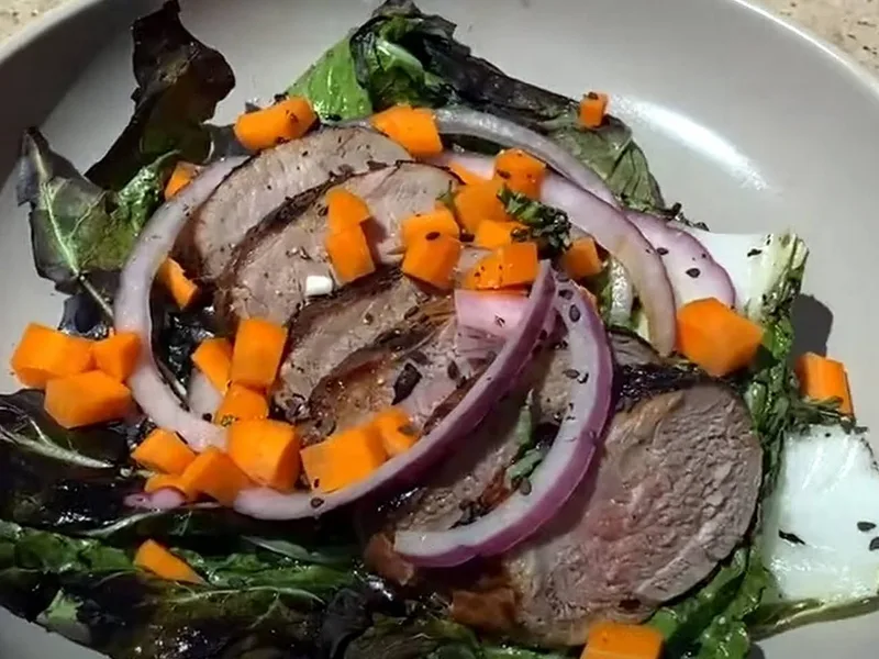 Pork adobo meets modern grilling in this elegant one-pan dinner combining tender, juicy pork tenderloin marinated overnight in ginger, soy, garlic, and lime with charred bok choy and bright pickled carrots and red onion. The dish balances rich, umami-forward marinade flavors with the sharp acidity of apple cider vinegar and fresh basil chiffonade, creating layers of taste and texture. Grilled pork develops a caramelized crust while remaining pink and tender inside when cooked to 145 degrees Fahrenheit. This restaurant-quality meal suits home cooks seeking impressive but straightforward entertaining, weeknight dinners that feel special, or summer gatherings. The combination of hot grilled protein and vegetables with cool pickled accompaniments and aromatic basil makes it ideal for warm-weather entertaining or meal prep that tastes fresh the next day.