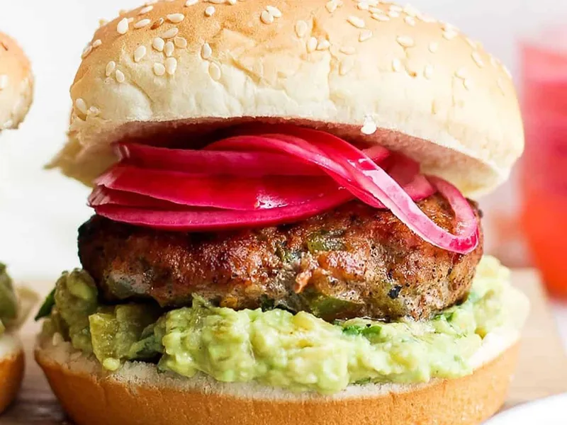 Lean ground turkey patties seasoned with cumin, garlic, and chiles, grilled until juicy and topped with fresh avocado mash and tangy quick-pickled red onions. The pickled onions add brightness and acidity while butter mixed into the patties keeps them moist despite turkey's low fat content. Perfect for weeknight dinners or casual entertaining when you want a lighter burger option without sacrificing flavor. This version emphasizes fresh garnishes and bold spices over heavy condiments.
