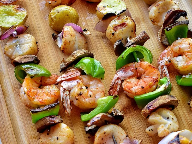 Succulent grilled shrimp and scallop kabobs dressed in a bright white wine and lemon garlic sauce create an elegant seafood skewer perfect for summer entertaining. Fresh Gulf shrimp and tender scallops alternate with charred vegetables—potatoes, red onion, bell pepper, and mushrooms—on individual skewers for impressive plating. The white wine sauce adds acidity and richness that complements the delicate sweetness of the seafood and caramelized vegetables. What makes this version special is the pre-cooked potatoes, which ensure even cooking across all components, and the convenience of the prepared sauce that delivers restaurant-quality flavor in minutes. This dish works for weeknight dinners, dinner parties, or special occasions. It appeals to seafood lovers seeking something lighter than meat-based kabobs yet more refined than casual grilling. Serve as a main course with sides like rice or crusty bread to soak up the sauce.