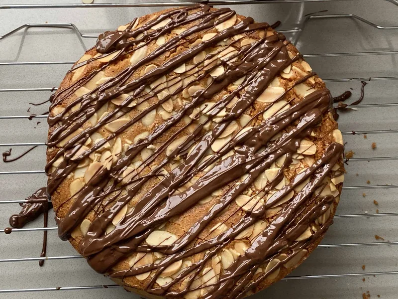 Tender, moist almond cake made with ground almonds and margarine, baked low and slow until golden. Topped with flaked almonds and a smooth chocolate drizzle. Light, nutty crumb with chocolate contrast.