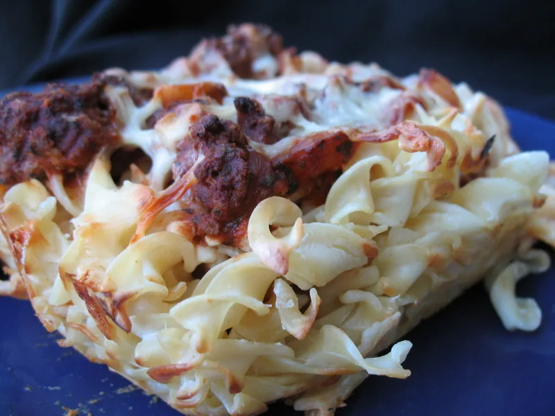 A comforting layered casserole combining seasoned ground beef, egg noodles, cottage cheese, and sour cream topped with melted cheddar. The beef is cooked with basil and tomato sauce, then layered with a creamy noodle mixture for a satisfying, family-friendly dinner. The sharp cheddar adds depth while the cottage cheese keeps it lighter than traditional versions. Serve warm from the oven for weeknight dinners or casual gatherings.