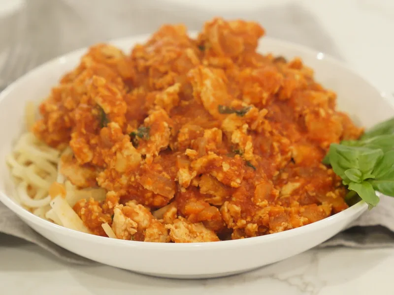 A hearty, protein-rich twist on classic Bolognese featuring both dark and white ground chicken in a rich tomato sauce subtly spiced with cinnamon and brightened with orange juice. The traditional pasta is replaced with spiralized kohlrabi noodles, creating a lower-carb alternative that maintains satisfying texture. This nutritious comfort meal works well for family dinners or meal prep, offering the familiar flavors of Bolognese while incorporating more vegetables. The combination of two chicken cuts provides depth of flavor, while the kohlrabi adds a mild, slightly sweet crunch that pairs beautifully with the robust sauce.