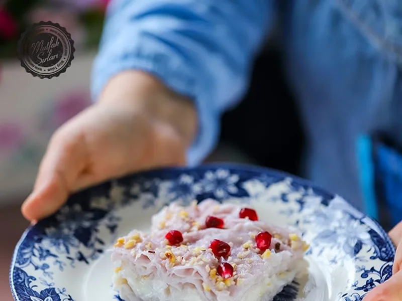 Turkish layered pastry dessert combining crispy gullac leaves with a silky milk custard and basil-infused syrup. Layers of delicate pastry alternate with creamy vanilla custard, topped with crushed nuts and pomegranate seeds for texture and brightness. A traditional Ramadan specialty with aromatic cinnamon and dried basil notes.
