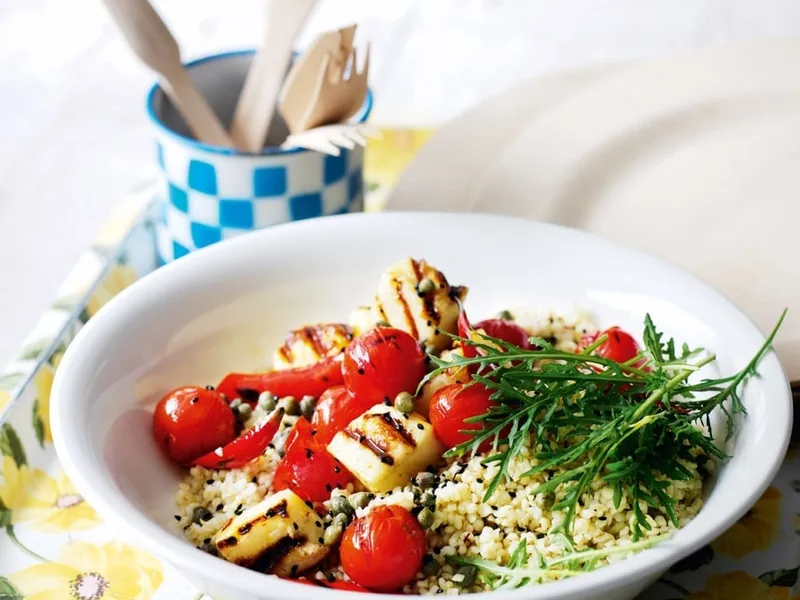 Charred halloumi, chillies and cherry tomatoes skewered and barbecued, served over saffron-infused bulgur wheat with a capers and sherry vinegar dressing. Black onion seeds and rocket complete this Mediterranean-inspired salad with smoky, tangy, and herbaceous notes.