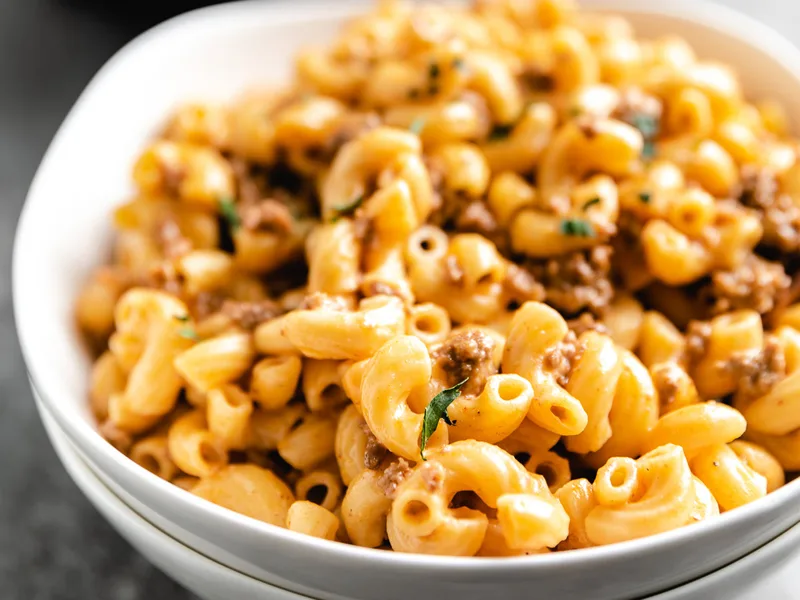 One-pan cheeseburger macaroni combines seasoned ground beef, elbow noodles, and beef broth simmered until tender, then finished with milk, sour cream, and sharp cheddar for a creamy, cheesy comfort dish. Ready in under 30 minutes with minimal cleanup.