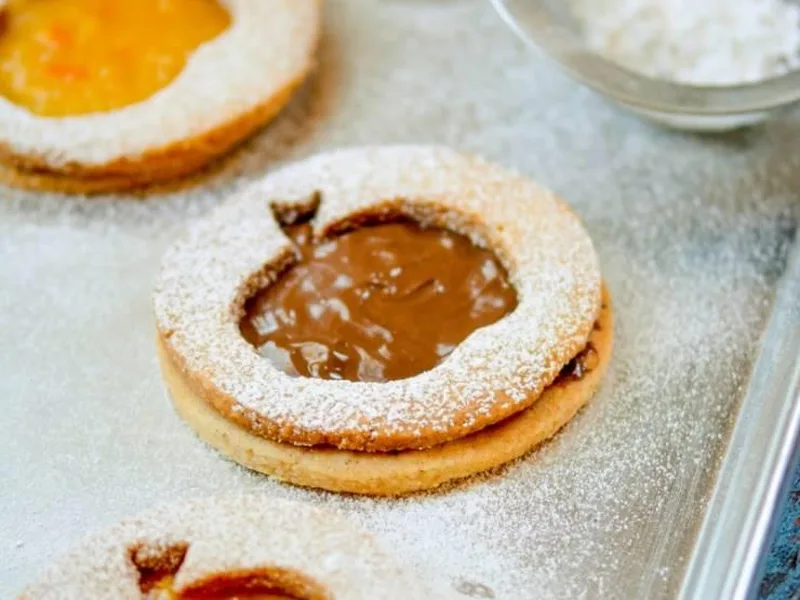 Double-layer sandwich cookies combining creamy hazelnut spread and bright jam with nutty almond meal and warm spices. The buttery shortbread base holds sweet fillings, while powdered sugar frames the apple-shaped cutout windows. Perfect for holiday gift boxes, afternoon tea, or any occasion calling for elegant homemade treats. This version uses both hazelnut and jam for contrast, with lemon zest adding subtle citrus notes that complement the filling flavors.