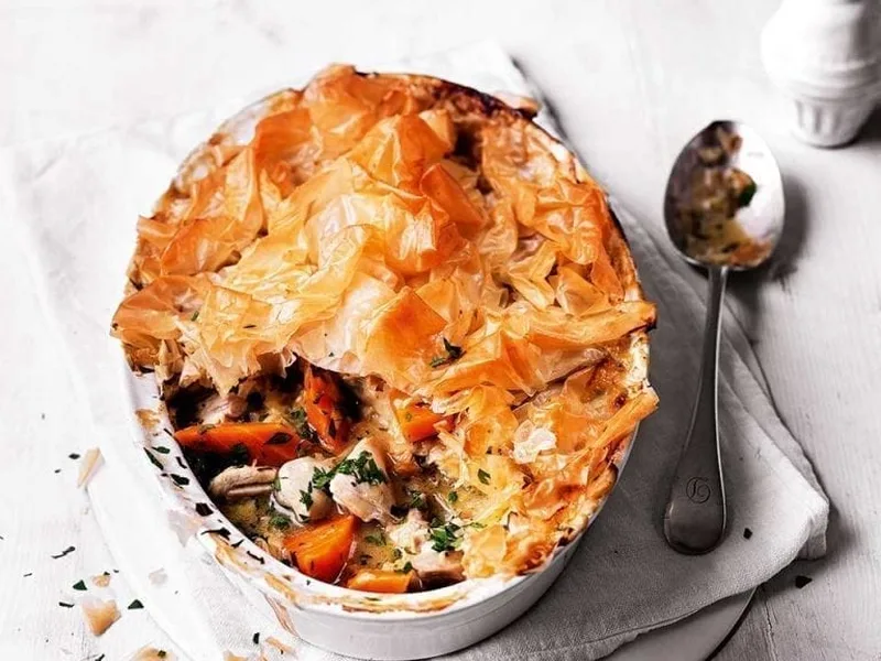 Lighter take on a British comfort classic using filo pastry instead of traditional pie crust. Tender chicken thighs braised with carrots, leeks, and dijon mustard in a reduced white wine and stock sauce, topped with crumpled golden filo sheets. Ready in under an hour.