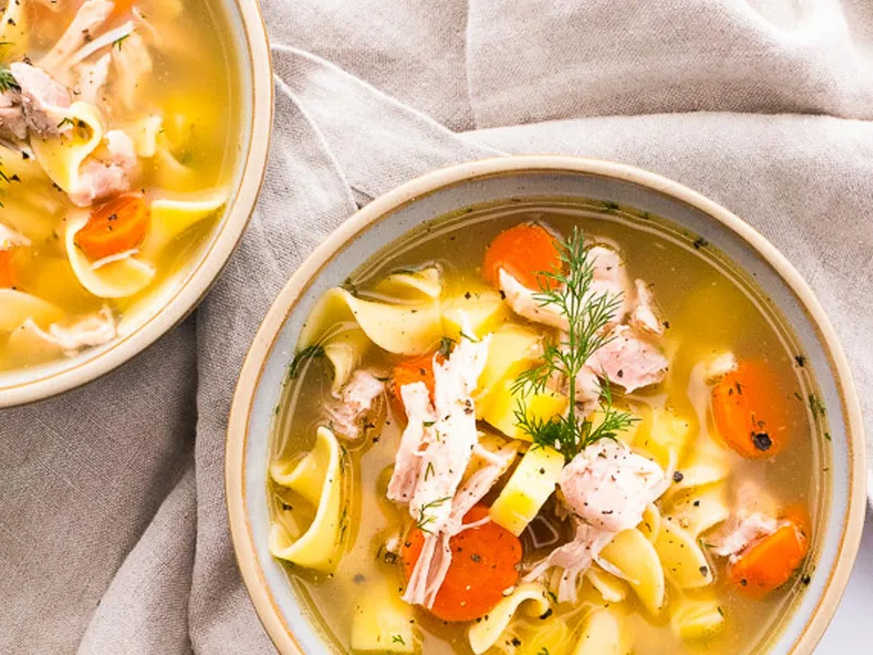 Classic chicken noodle soup made with bone-in thighs simmered in low-sodium stock with aromatic vegetables, egg noodles, and fresh herbs. Chicken is cooked until tender and can be shredded directly in the pot. The broth is clarified by skimming foam during the initial boil, then finished with dill, parsley or green onion and grated garlic for brightness.