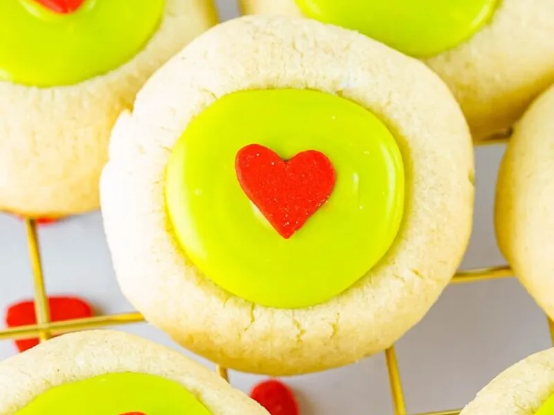 Buttery sugar cookies with deep thumb-pressed indentations, filled with smooth neon green candy melts and topped with red heart sprinkles. Light, crumbly texture with a striking contrast between pale cookie and vibrant green filling. Perfect for holiday baking with minimal decorating skill required.