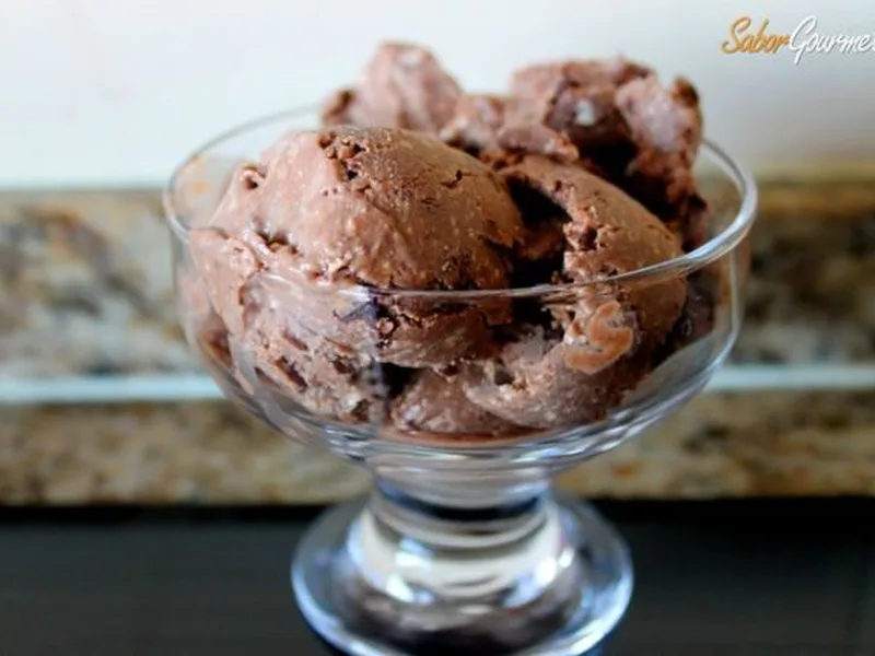 Intense homemade chocolate ice cream made without an ice cream maker, combining whipped cream and a chocolate custard base. Egg yolks and powdered sugar create a creamy foundation mixed with chocolate drink and chopped chocolate pieces for a crunchy texture. Requires periodic stirring during freezing to break up ice crystals.
