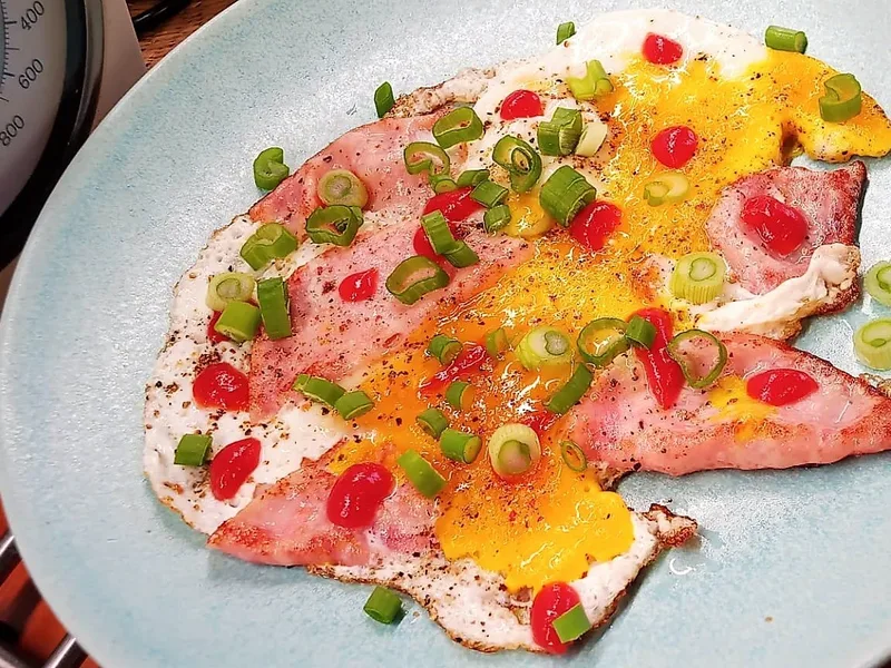 Pan-fried ham topped with eggs cooked until set, seasoned with salt and colored pepper. Garnished with fresh herbs or spring onion greens and served on a plate with fresh bread for breakfast.