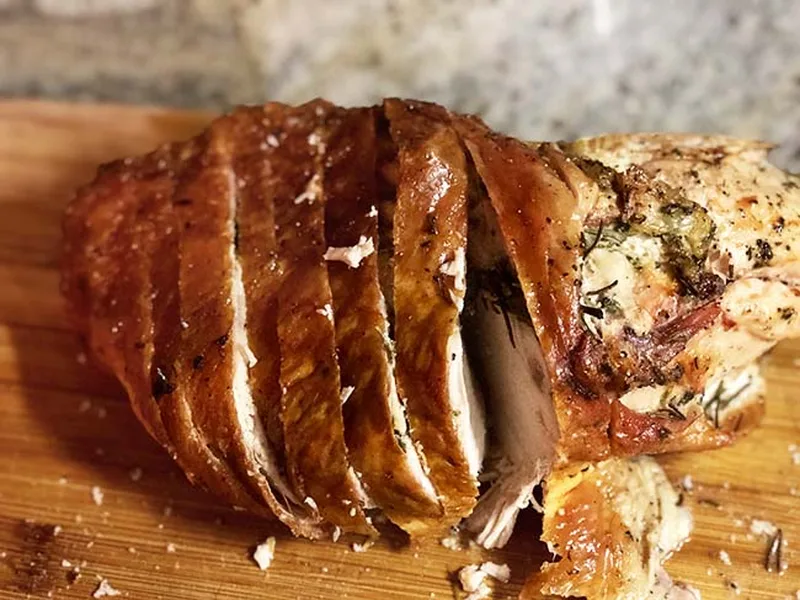Rubbing herb oil under the skin keeps the meat moist while allowing skin to crisp. This two-zone seasoning technique ensures flavor penetrates without drying the breast exterior. Always gently lift skin to avoid tearing.