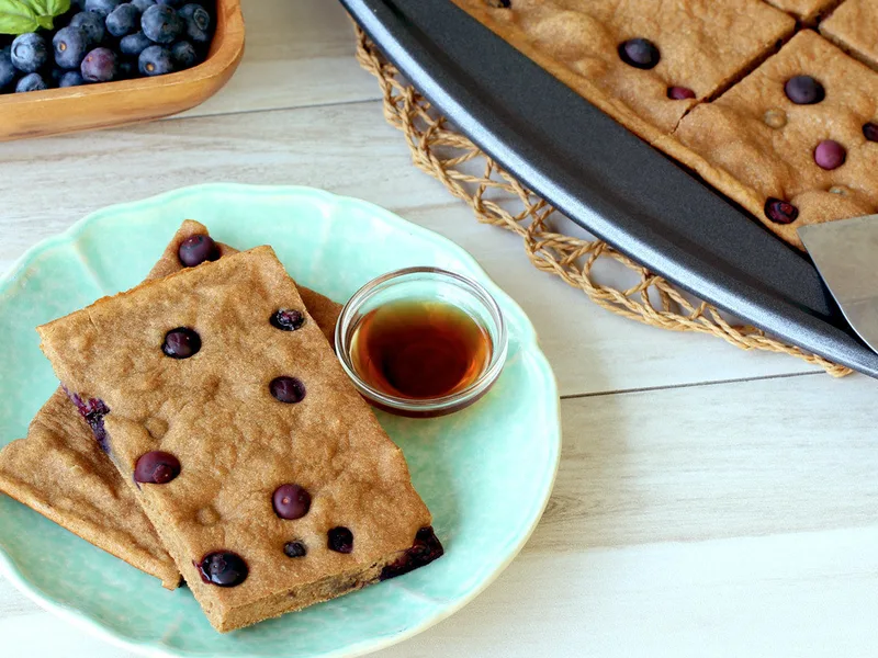 Sheet pan pancake bars loaded with blueberries, protein powder, and warm cinnamon spice. These grab-and-go bars deliver fluffy pancake texture with a nutritional boost from whey protein, making them ideal for busy weekday breakfasts or meal prep. The maple extract adds depth without extra calories, while the no-calorie sweetener keeps sugar minimal. Perfect for health-conscious breakfast eaters who want homemade pancakes without the griddle work.