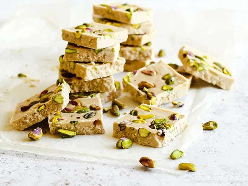 This modern twist on traditional Middle Eastern halva combines tahini and coconut butter for a rich, creamy base, enhanced with collagen powder for extra protein. The sugar-free sweetener and warming cinnamon create an authentic flavor profile, while chopped pistachios add delightful texture and nutty taste. Perfect for those following ketogenic lifestyles or anyone seeking a healthier dessert alternative. The no-bake preparation makes it simple to prepare, requiring only gentle warming to combine ingredients before setting in the refrigerator. Each square delivers satisfying richness without compromising dietary goals.