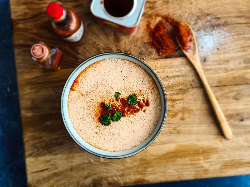 Creamy whiskey sauce combining whipped cream, mayonnaise, ketchup, and smoked paprika. Tangy and smoky with a kick of whiskey and tabasco heat. Quick to prepare, perfect for steaks, burgers, or grilled meats.