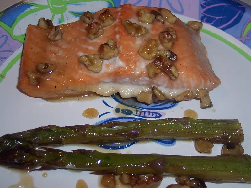 Sprinkle walnuts over vegetables and salmon.